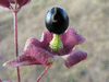 Plante couchée à la base, pouvant atteindre 2 m. en prenant appui sur les supports voisins; tige pubescente grêle, voire cassante. En fin de saison, elle arbore une teinte vieux rose à prune d'où les fruits noirs se détachent. |